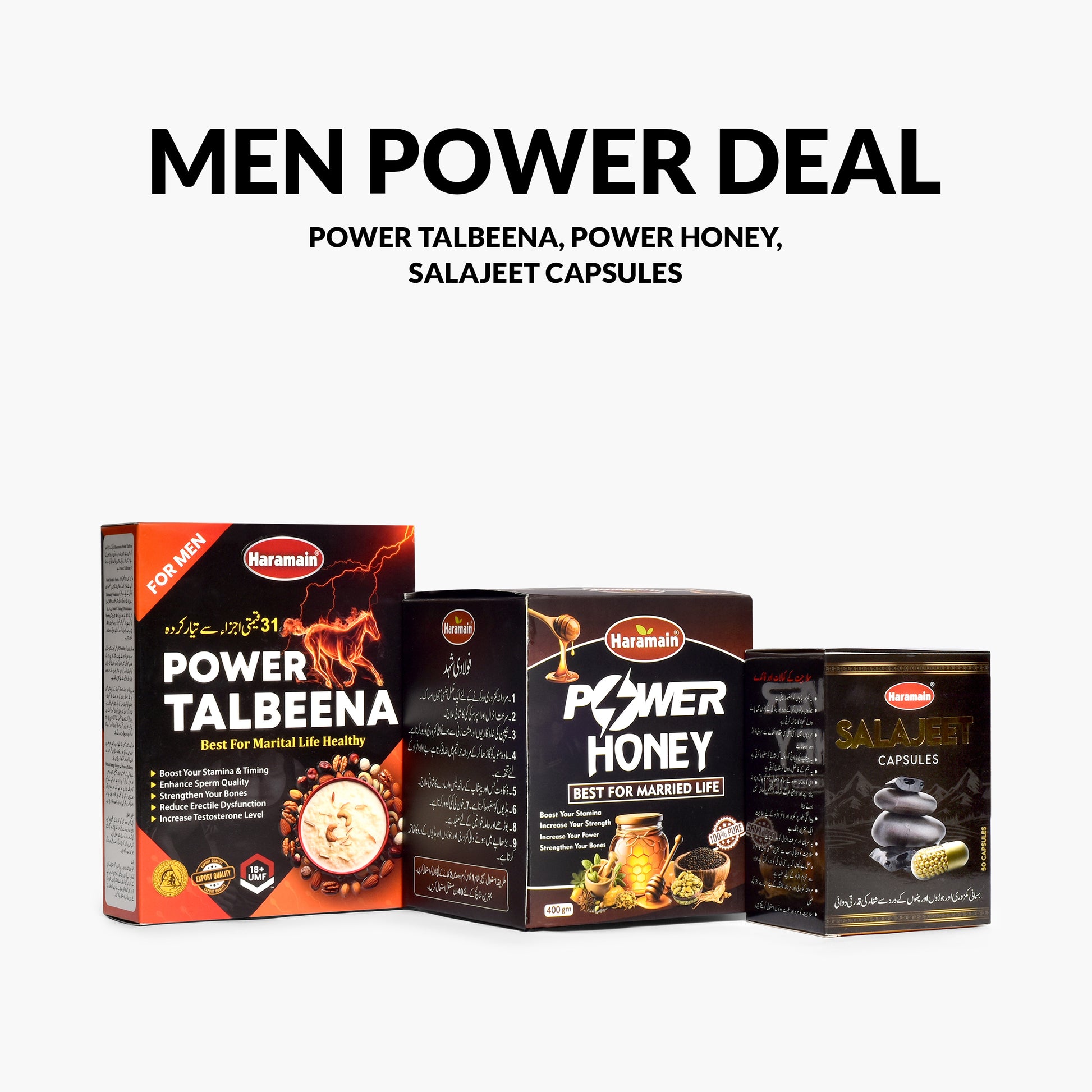 Haramain Foods proudly presents the Men’s Power Deal — a premium health bundle created especially for married men who want to enjoy lasting strength, vitality, and a more fulfilling lifestyle. Carefully curated with Power Talbeena, Shilajit Capsules, and Power Honey, this package not only fuels your body but also supports energy, confidence, and a happier married life.